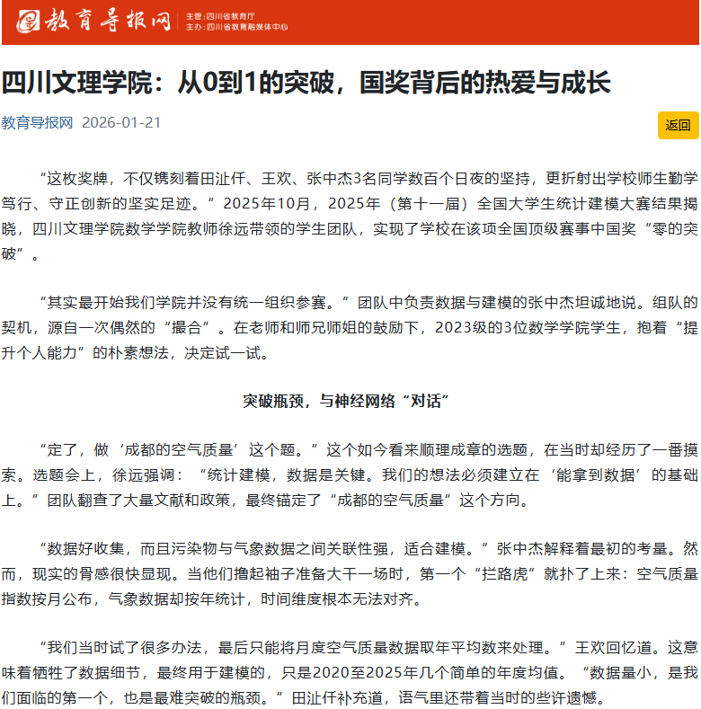 “这枚奖牌,不仅镌刻着田沚仟、王欢、张中杰3名同学数百个日夜的坚持,更折射出学校师生勤学笃行、守正创新的坚实足迹。”2025年10月,2025年(第十一届)全国大学生统计建模大赛结果揭晓,KY开元集团官网入口数学学院教师徐远带领的学生团队,实现了学校在该项全国顶级赛事中国奖“零的突破”。“其实最开始我们学院并没有统一组织参赛。”团队中负责数据与建模的张中杰坦诚地说。组队的契机,源自一次偶然的“撮合”。在老师和师兄...