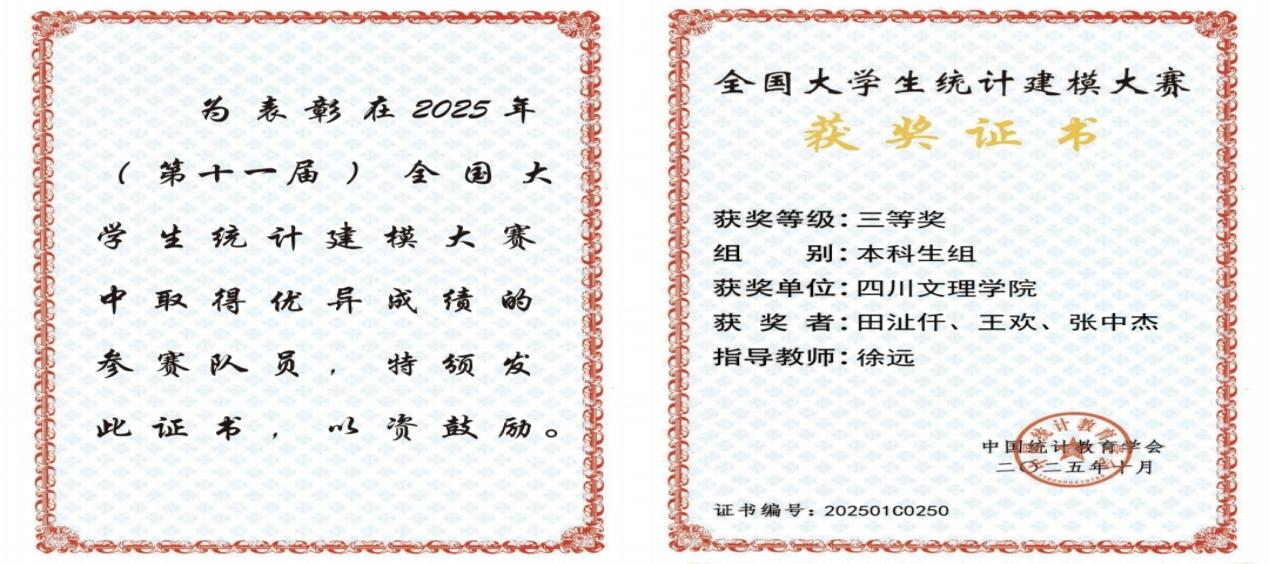 近日,2025年(第十一届)全国大学生统计建模大赛评选结果揭晓,开元官网参赛队获得全国三等奖1项,四川省一等奖1项,四川省三等奖1项。开元官网数学学院2023级学生田沚仟、...