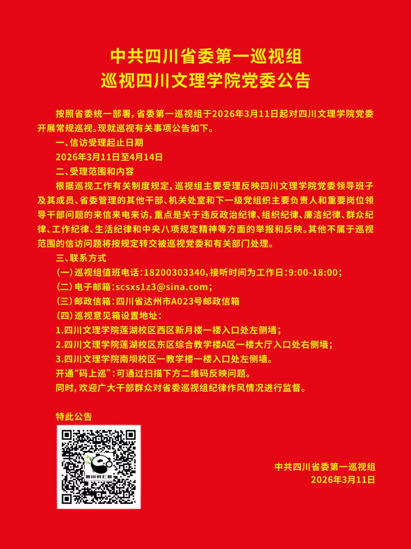 3月13日上午,二届党委第五轮巡察工作动员部署会在莲湖校区召开。党委书记、巡察工作领导小组组长黄涛出席会议并讲话。会议由驻校纪检监察组组长、党委副书记、纪委书记、巡察工作领导小组常务副组长帅胤主持。会上传达学习了中央、省委关于巡视巡察的最新精神,对二届党委第五轮巡察工作进行动员部署。党委副书记、巡察工作领导小组副组长徐晓宗宣布第五轮巡察工作授权任职及任务分工。会议强调,一要提高政治站位,深刻领悟政...