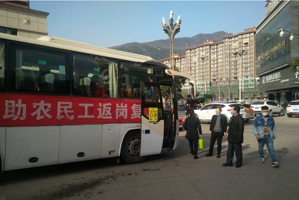 李玉印(右二)指导农民工有序返岗