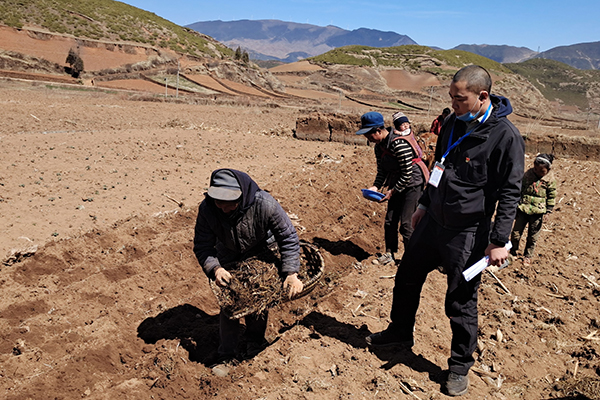 文敏熙(右一)查看大黄苗种植情况