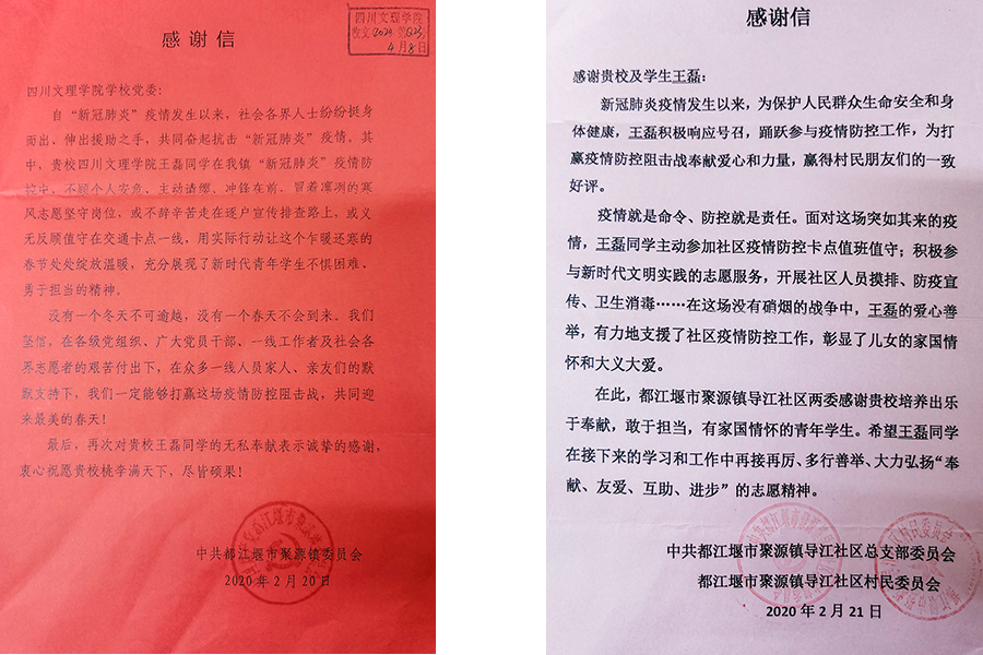“王磊的爱心善举有力地支援了社区疫情防控工作,彰显了中华儿女的家国情怀和大义大爱。”日前,学校又收到一封由中共都江堰市聚源镇委员会和导江社区村支“两委”寄来的感谢信,对开元官网体育学院2019级7班的王磊同学在家乡积极响应号召,勇于担当奉献,踊跃参与疫情防控工作予以感谢和称赞。