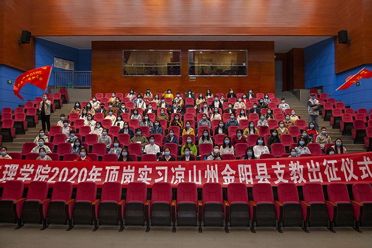 4月20日,2020年春顶岗实习凉山州金阳县支教工作会暨出征仪式在莲湖校区举行,欢送103名青年学子奔赴凉山州金阳县参加顶岗实习支教工作。党委书记王成端,党委副书记、校长刁永锋讲话并为支教团授旗,副校长李壮成主持出征仪式。