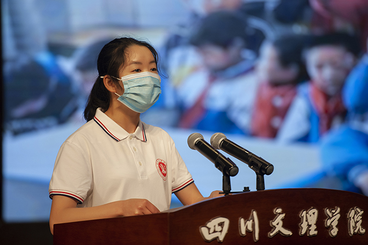 顶岗实习支教学生代表黄菊表示将发扬“艰难困苦,玉汝于成”的文理精神,克服困难,勤奋工作,用实际行动践行一名人民教师的责任与担当。