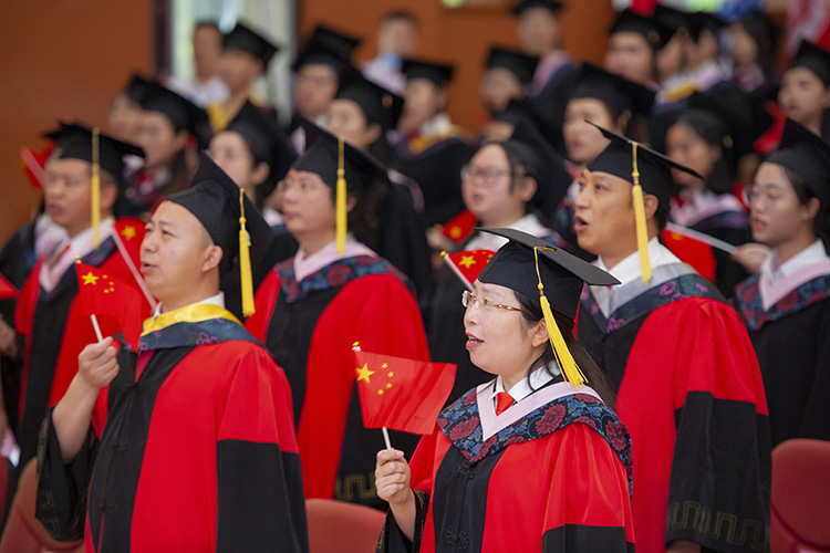 在庄严的国歌声中,2020届毕业典礼暨授位仪式正式开始。因处于疫情防控特殊时期,188名毕业生代表参加了现场典礼暨授位仪式,学校通过官方微博同步在线直播,师生通过“云端”观看并见证了这特殊、庄严的时刻。