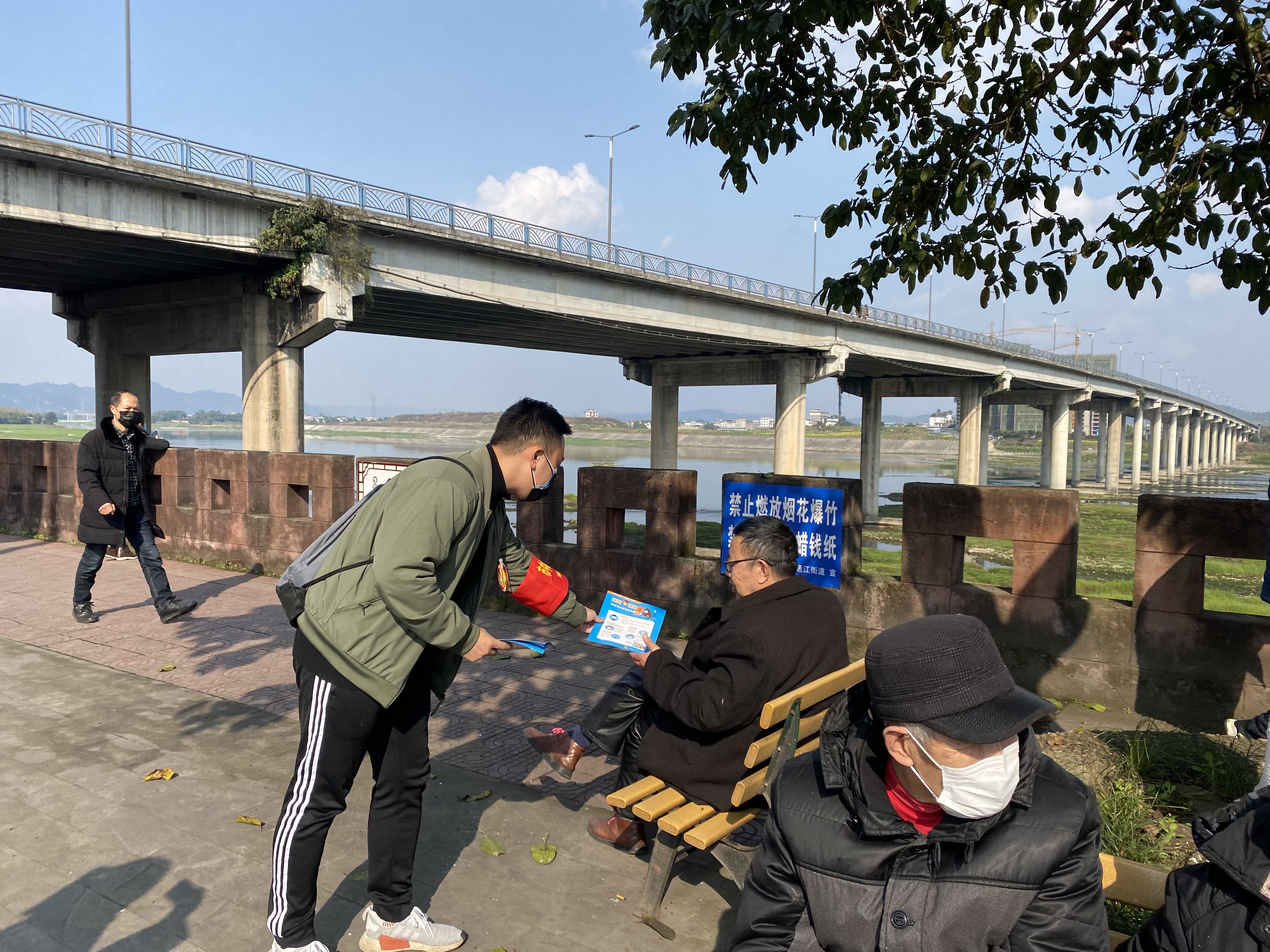 生态旅游学院2017级3班学生邓力铭积极参加到乐山市市中区团区委组织的青年突击队中,为居民发放防疫宣传单,并提醒没戴口罩的群众做好个人防护。