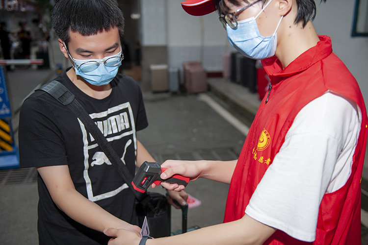 志愿者为到校学生测体温