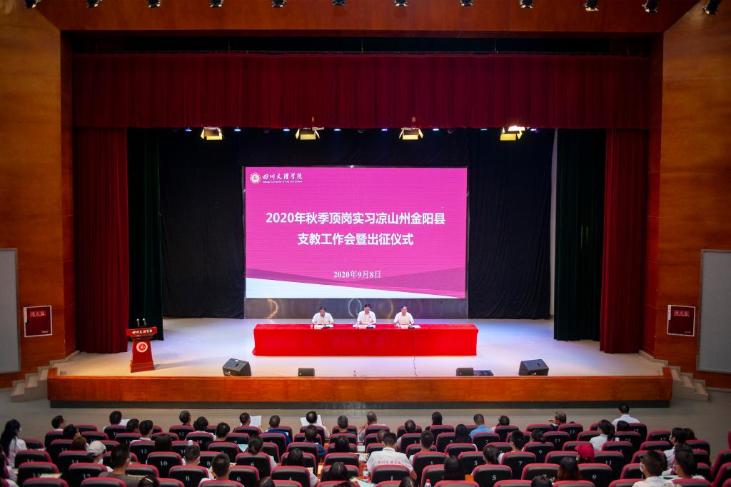 9月8日,2020年秋顶岗实习凉山州金阳县支教工作会暨出征仪式在莲湖校区举行,欢送107名青年学子奔赴凉山州金阳县参加顶岗实习支教工作。党委书记王成端,党委副书记、校长刁永锋讲话并为支教团授旗,副校长李壮成主持出征仪式。