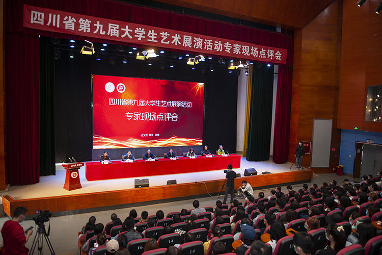 10月23日下午,四川省第九届大学生艺术展演活动专家现场点评会在莲湖校区多功能厅举行。省教育厅体卫艺处副处长杨荔,四川音乐学院党委常委、副院长孙洪斌教授,四川省歌舞剧院国家一级导演刘凌莉,成都理工大学传播科学与艺术学院院长刘翼教授,四川音乐学院小提琴学科带头人李开祥教授,宜宾学院艺术与产品设计学院院长杨建涛教授,以及学校党委副书记侯忠明教授等出席点评会,点评会由杨荔主持。