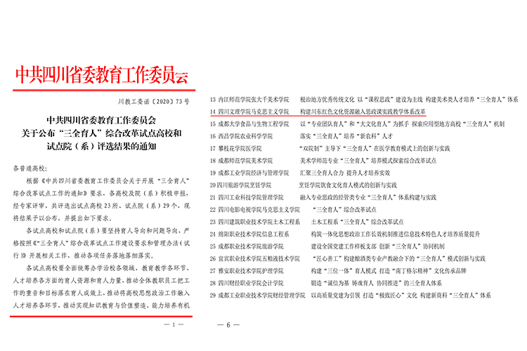 近日,省委教育工委公布了“三全育人”综合改革试点高校和试点院(系)评选结果,开元官网马克思主义学院成功入选四川省“三全育人”综合改革试点院系。