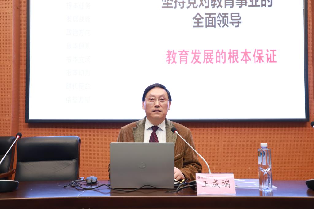 王成端教授勉励同学们要认真学习、贯彻习近平总书记教育重要论述,在学习中持续追踪、动态更新,不断加深认识,以更加坚定的理想信念和历史担当,承担起新时代教育的新使命,为实现“两个一百年”奋斗目标和中华民族伟大复兴的中国梦接续奋斗。