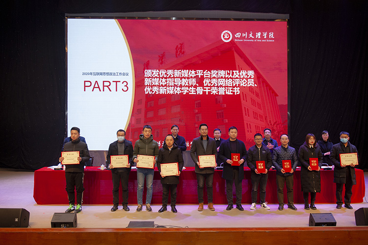与会校领导为2020年校内优秀新媒体平台、指导教师、网络评论员、学生骨干颁发奖牌及证书。