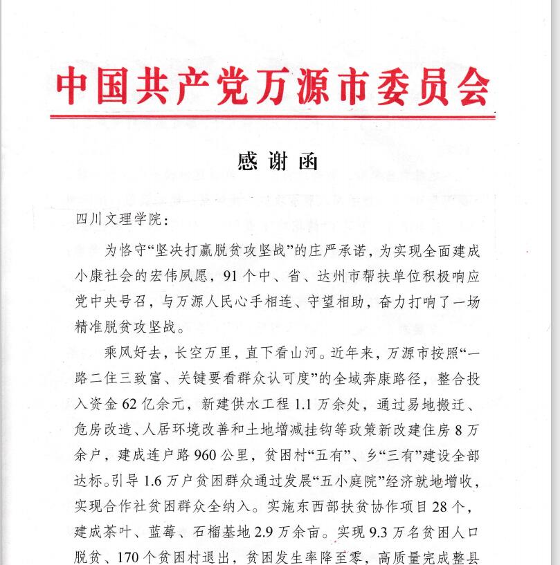 日前,中共万源市委、万源市人民政府致函开元官网,感谢开元官网对万源市脱贫攻坚工作的大力支持。