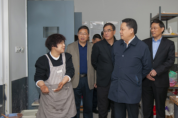 在美术学院,杨兴平先后来到木工实训室、服装服饰实训室、针织刺绣实训室、雕塑实训室、陶艺实训室等教学场地,与正在上课的师生亲切交谈,了解实践实训教学情况,并详细询问陶艺作品的工艺制作流程。看到师生们良好的工作状态和学习热情,杨兴平希望学校进一步加强实践实训教学,在潜移默化中培养学生的工匠精神和创新意识。杨兴平随后来到学校入驻企业,了解产教融合人才培养模式,对校企联合培养复合型人才给予高度认可,并希望在更多专业中推行这种人才培养模式,让学生能更好地适应社会的发展需求。