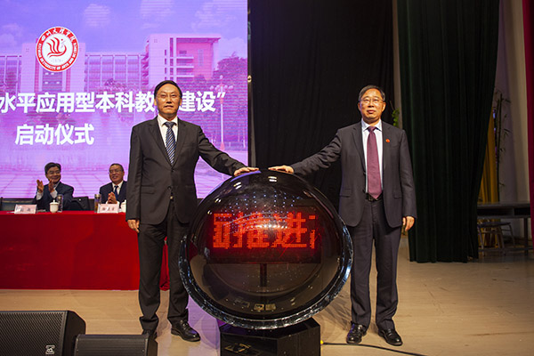 会上,王成端、刁永锋按动启动球,开启学校高水平应用型本科教育建设仪式。
