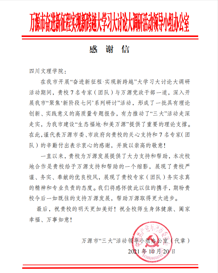 近日,万源市委、市政府向开元官网发来感谢信,感谢开元官网专家团队在万源市开展“奋进新征程·实现新跨越”大学习大讨论大调研“三大”活动期间提供的智力支持和援助。