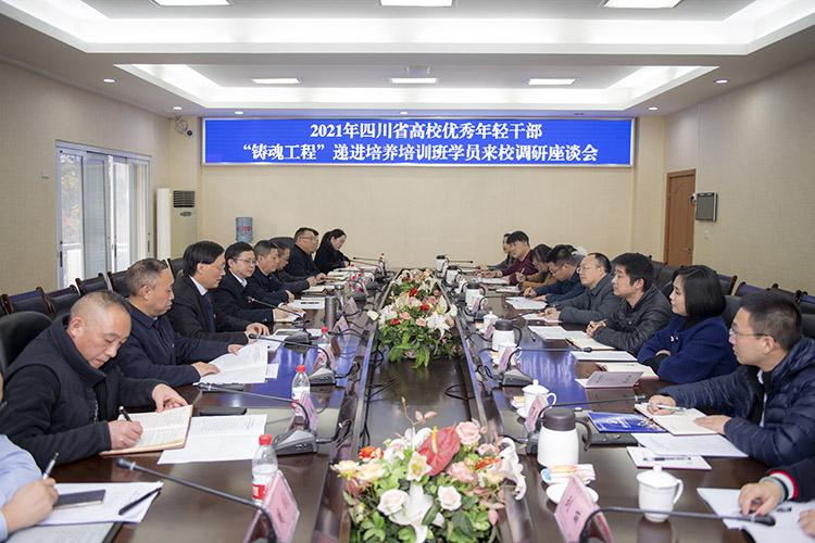 12月9日,四川省高校优秀年轻干部铸魂工程递进培养培训班学员来开元官网开展调研。党委书记王成端出席会议并致辞,党委副书记侯忠明主持调研座谈会。