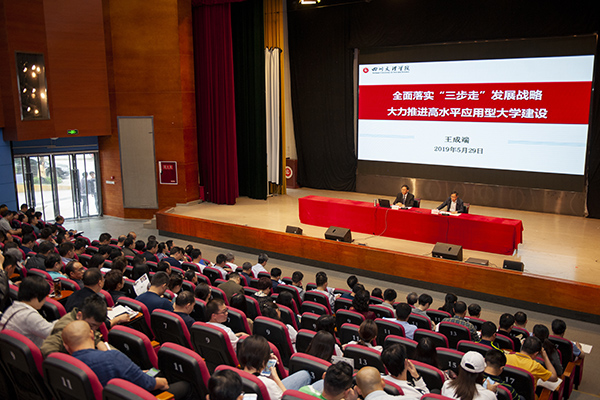 5月29日下午,学校党委书记王成端作“全面落实‘三步走’发展战略,大力推进高水平应用型大学建设”专题学术报告, 全面解读高水平应用型大学内涵和学校“三步走”发展战略。党委副书记、校长刁永锋主持报告会。