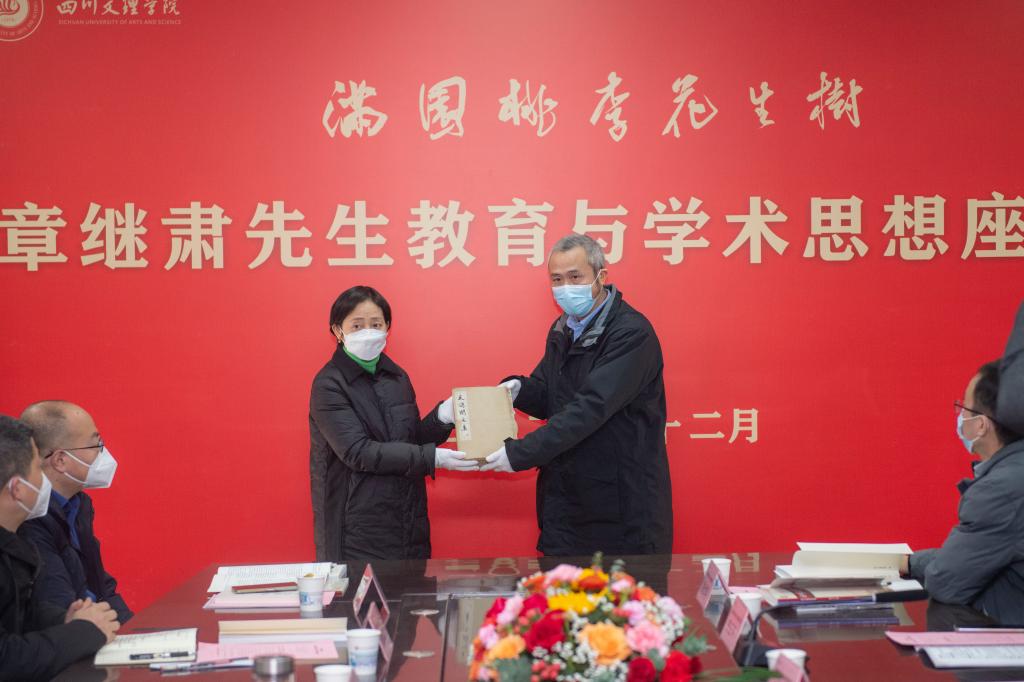 青年篆刻家尹义桐向学校捐赠印章“章继肃先生诞辰一百周年”原石。章继肃先生亲人代表章忠至向学校捐赠章继肃先生生前手稿《天问阁文集》。与会人员观看视频《木铎金声——章继肃先生生平与学术》。