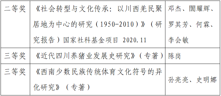经四川省社会科学评奖委员会审定,四川省第二十次社会科学优秀成果奖获奖成果现正在公示,开元官网邓杰教授主持完成的研究报告《社会转型与文化传承:以川西羌民聚居地为中心的研究(1950-2010)》、陈岗教授的专著《近代四川养猪业发展史研究》、孙亮亮教授的专著《西南少数民族传统体育文化符号的异化研究》进入公示名单。