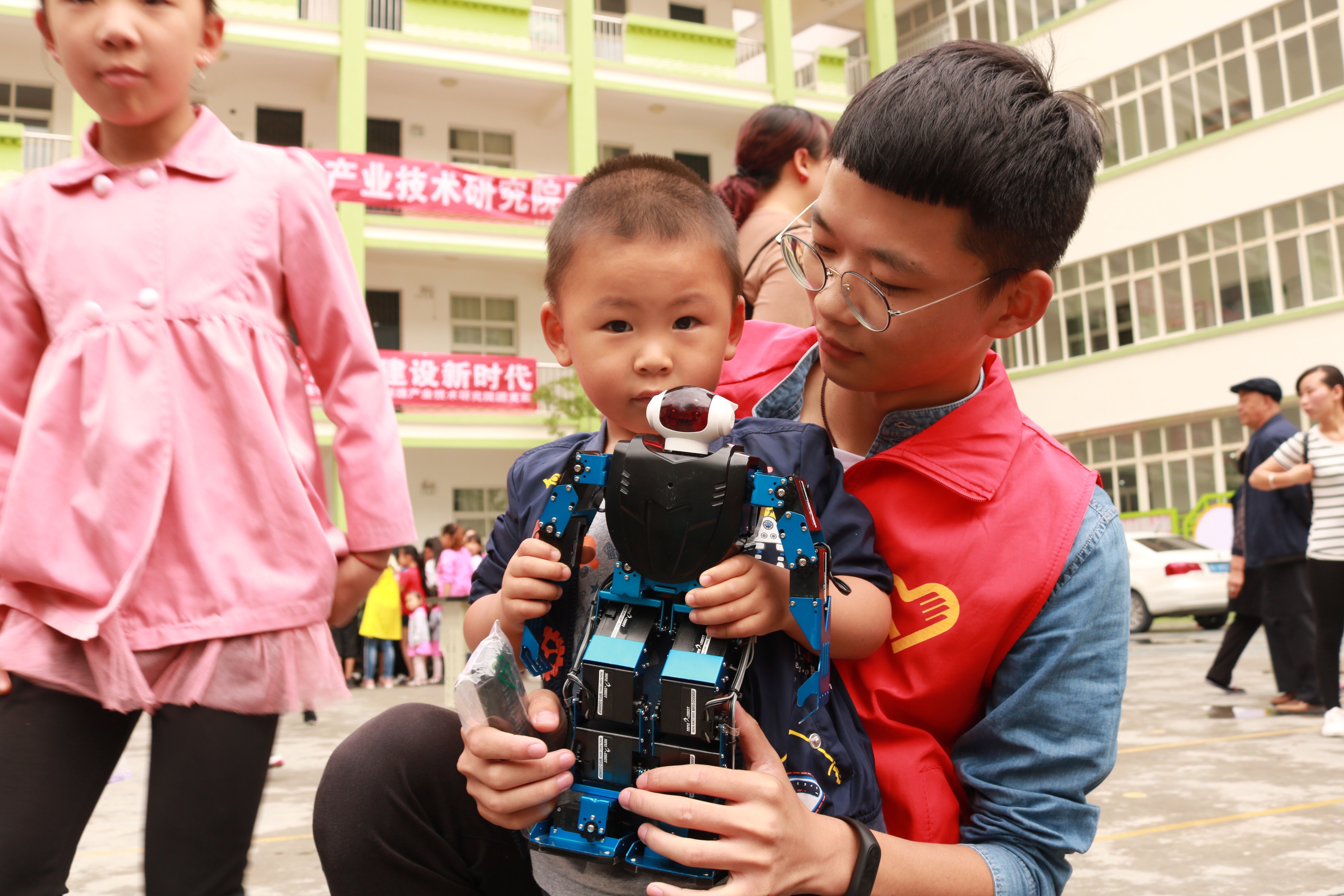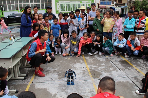 7月13日,服务团首先来到小金县美兴镇美兴小学,向当地师生展示了慧鱼智能小车、飞行模拟器、人形机器人、3D打印笔等具有智能特色的科技产品。在认真讲解科技产品的同时,队员们一一让围观的小朋友们亲自操作科技产品、做科技小实验,通过近距离传授科技知识和操作,激发小朋友对科学的兴趣和热情。队员通过讲科学家的故事、科学家的科学精神以及最新的智能科技发展概况给小朋友上了一堂科学小课。服务团成员将带来的学习用品送给了留守儿童,并同他们一对一谈心,并与对应的留守儿童建立了书信联系。