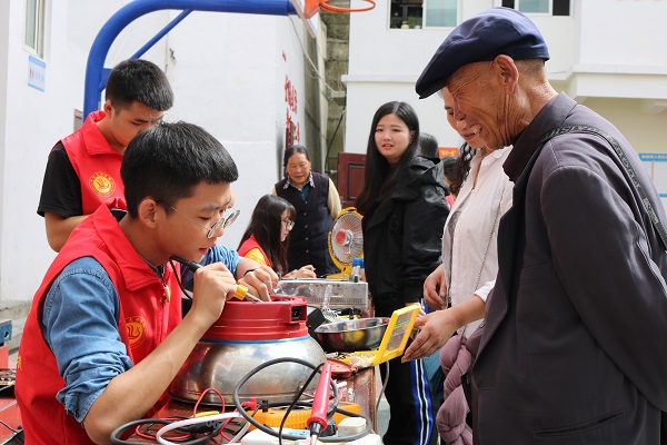 7月14日早上,服务团早早的来到小金县达维镇人民政府院内替村民们维修电器。尽管烈日高悬,志愿者们依然干劲十足,对故障电器认真检测、拆卸维修及安装。十个小时下来,维修小队一共接受了热水壶、电磁炉、电饭煲、暖电器、电吹风、电视、洗衣机等各式电器63件,为村民节约了近3000元维修费。志愿者扎实的技术和良好的服务态度受到乡亲们的一致认可。
