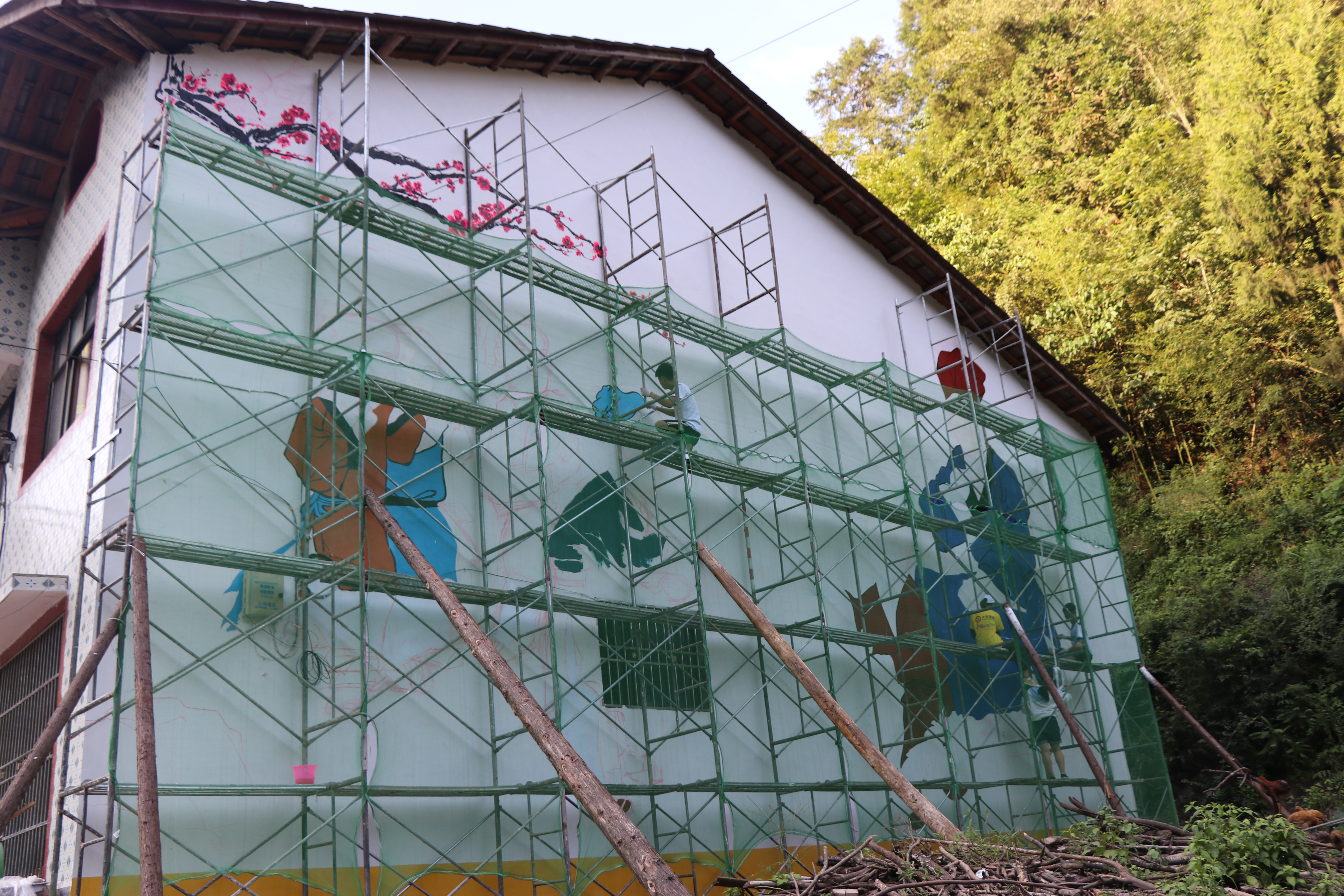 志愿服务团由4名指导教师和43名学生,共47人组成。此刻,他们不是画者身份,俨然变成了乡村的粉刷匠,也许还可以给他们一个称谓“空中行走的粉刷匠”,吊着安全绳,来来回回的穿梭在钢架之间,爬上高架的那一刻,他们恨不得有几双手多拿工具上到高层,腿变长点一步登天。