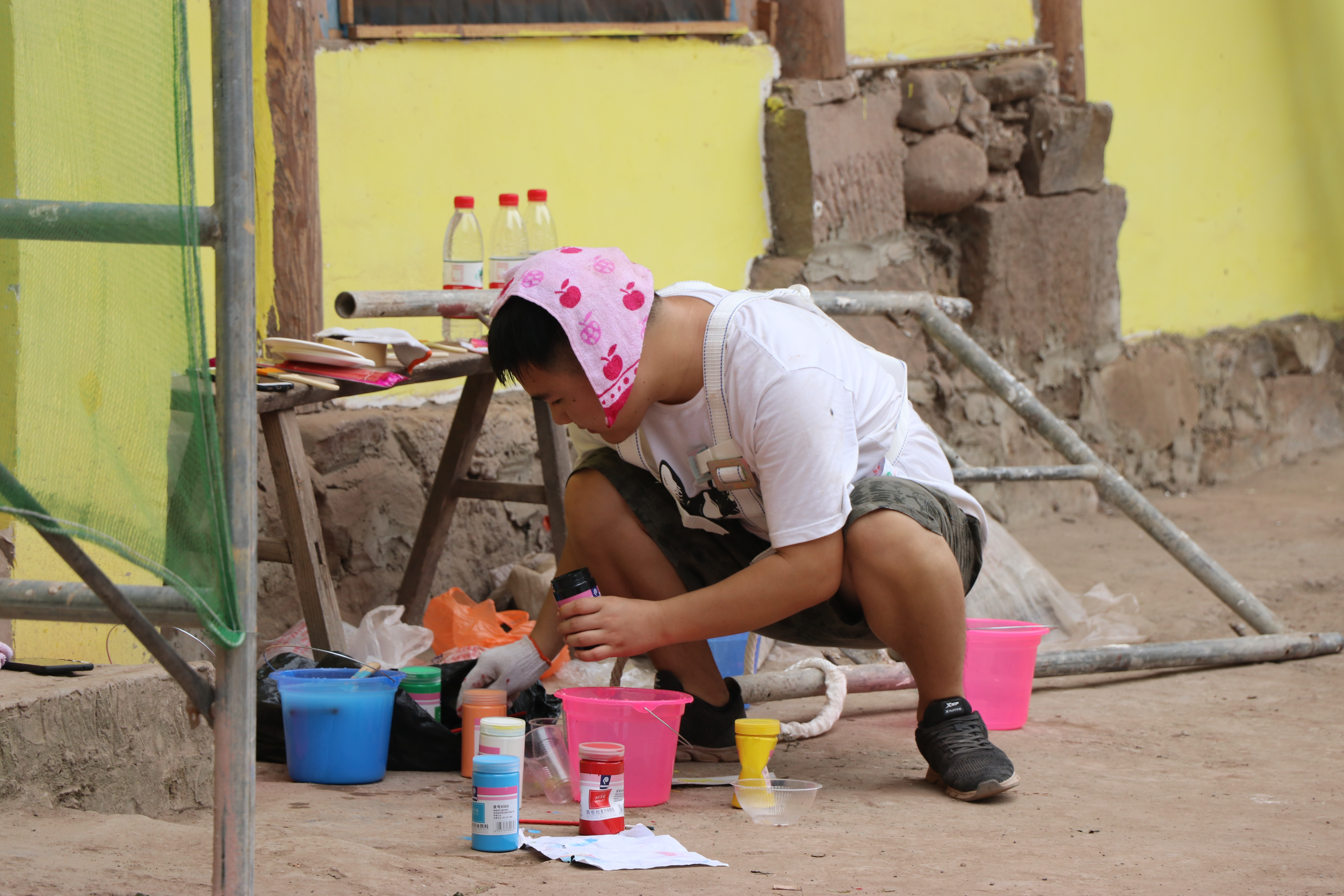 一切准备好以后,他们手里的刷子蘸上鲜艳的颜料,涂在墙面上。临近中午,太阳高照,阳光变得刺眼又火辣,志愿者得顶着湿毛巾,带上冰袖,才能继续手中的活计。颜料在高温下很容易变干,志愿者们在烈日下不断用清水兑着颜料。上面画画的同学认真听着下面同学的指挥,配合得极其完美。隔远一看,墙面的图案在他们配合下竟然如此引人注目。村民高兴地说:“墙绘内容非常贴近我们的生活,内容也很丰富,充分地将咱们村庄的乡土风俗表现出来,KY开元集团官网入口的老师和学生非常优秀,我为他们点赞。”