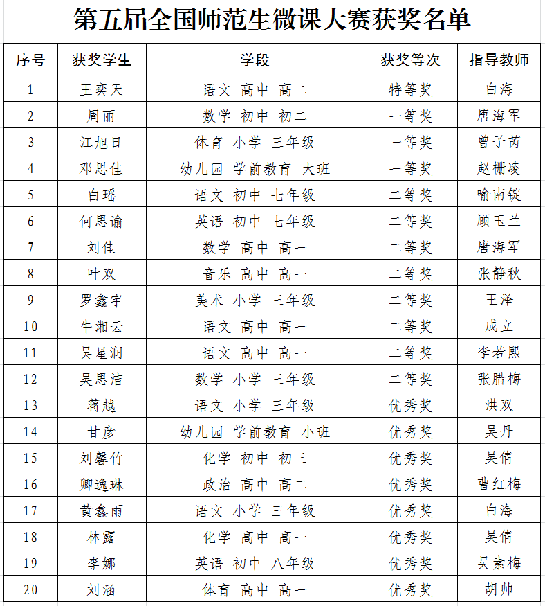 近日,第五届全国师范生微课大赛结果公布,开元官网共计获奖20项,其中特等奖1项,一等奖3项,二等奖8项,优秀奖8项。文学与传播学院白海教授获评优秀指导教师,学校荣获“优秀组织单位”称号。