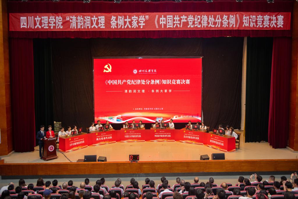 6月13日,党委宣传部、校纪委办公室联合策划举办的“清韵润文理 条例大家学”《中国共产党纪律处分条例》知识竞赛(决赛)在学校艺术传媒大楼多功能演播厅顺利举行。省纪委监委驻校纪检监察组组长、校党委副书记、纪委书记帅胤和党委常委、副校长程碧英出席决赛现场,学校各职能部门负责人及部分二级学院党委书记亲临现场观赛。比赛特别邀请了政法学院、知识产权学院党委书记岳臣忠、院长刘长江和朱仕金博士组成专家答疑组。