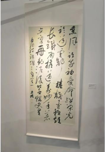 校长侯忠明教授书法作品《自作诗·锦城三章其一》书体选择了素日最擅长的大草。创作之初,构思有三:一是敢于做字形大小对比;二是在法度里进行墨色层次渐变;三是纵向长线条的表现。正式书写时,任感性发挥,信手自然,不计工拙,一气呵成。