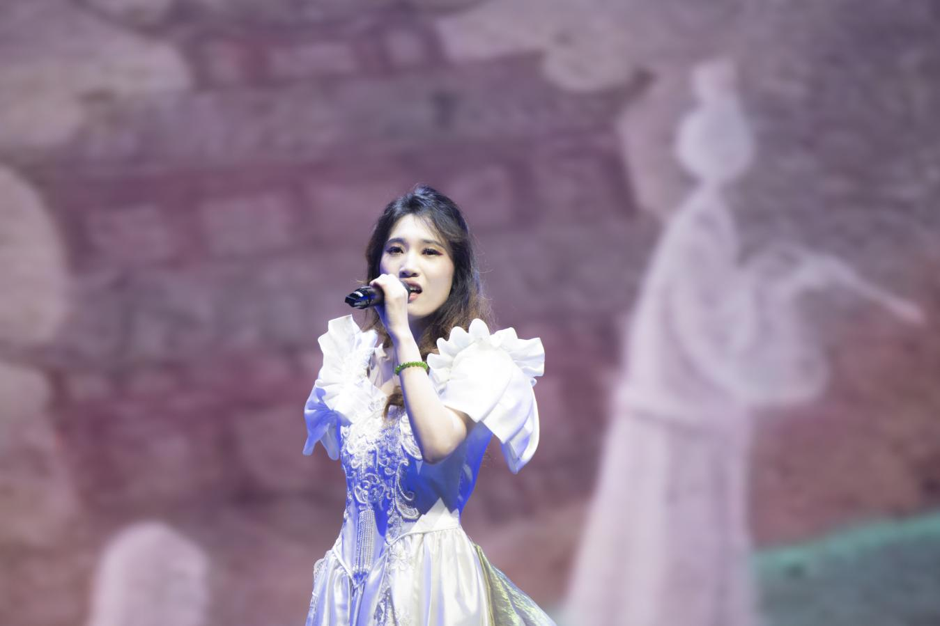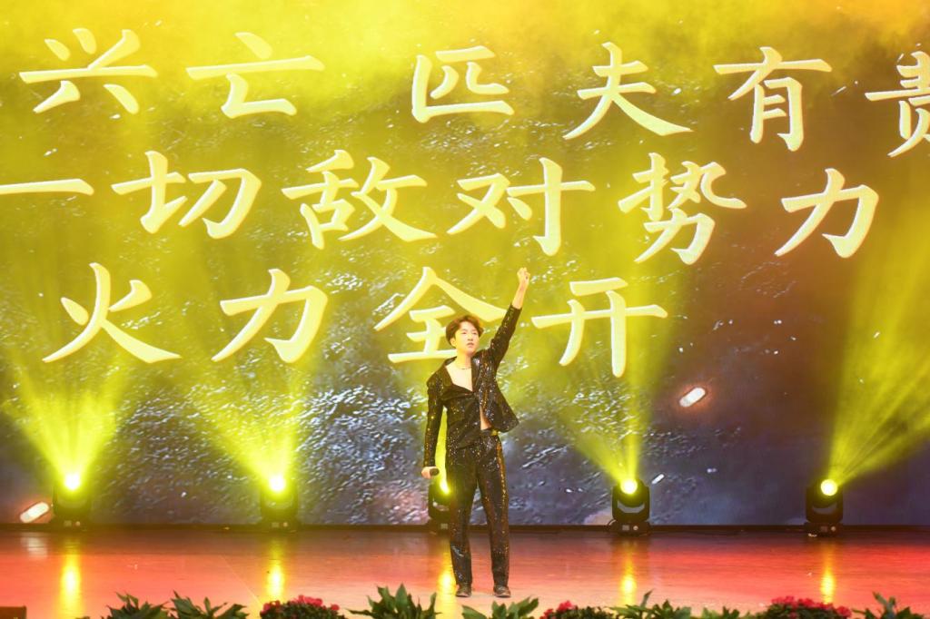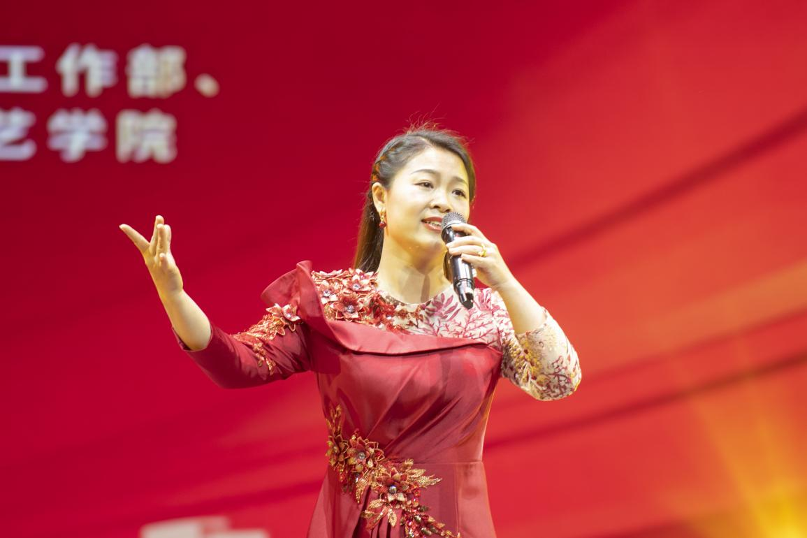 音乐与演艺学院青年教师陈娟登台献唱《绣红旗》,以过硬专业能力,饱含深情的演唱,唱出对祖国河山的热爱,将现场气氛烘托上了高潮,引起师生共鸣,赢得阵阵掌声。