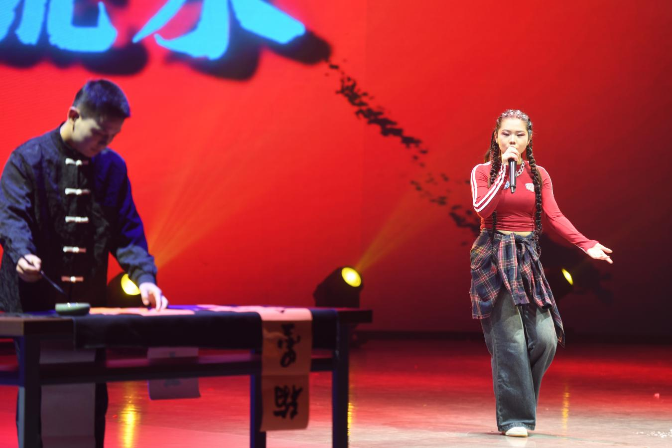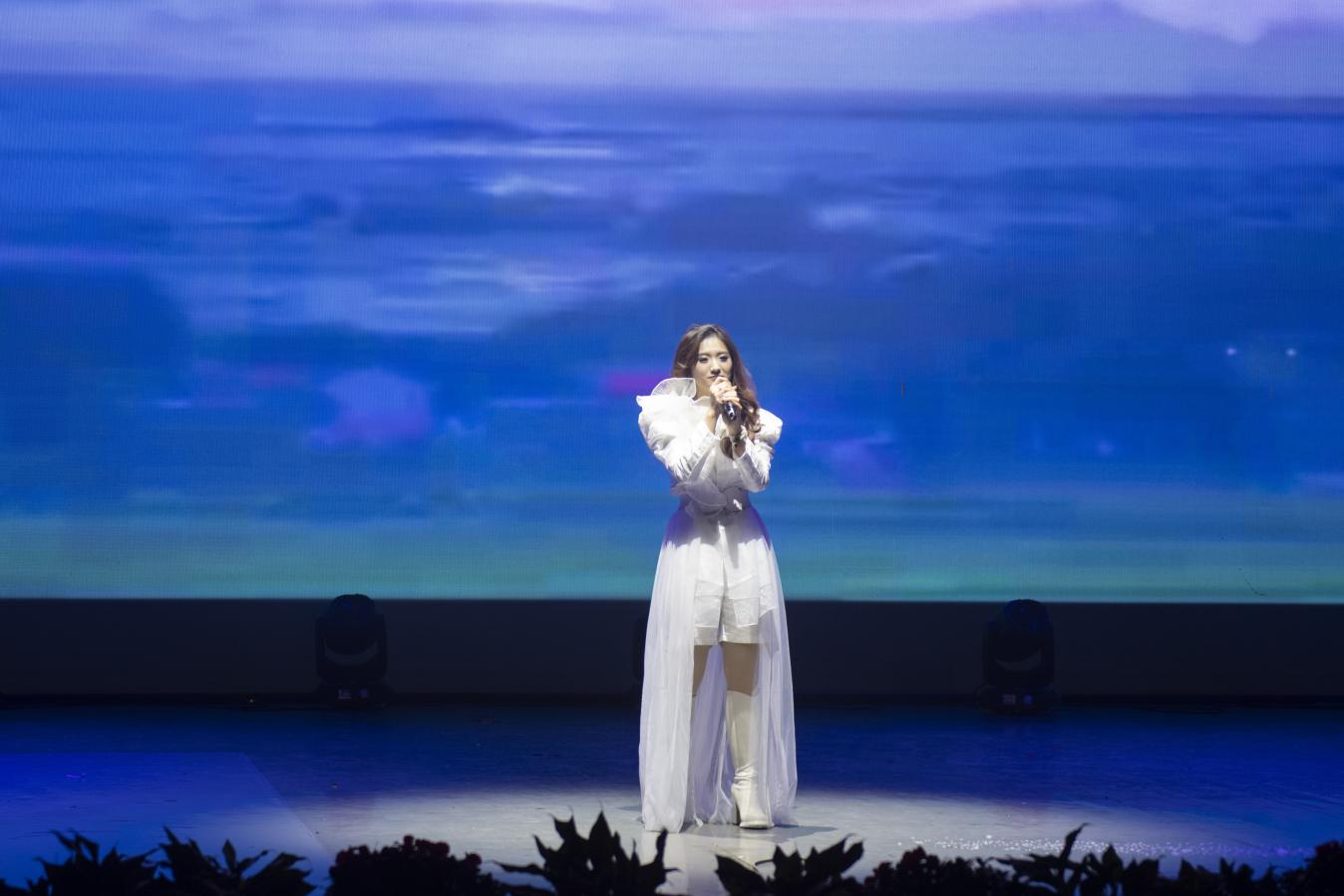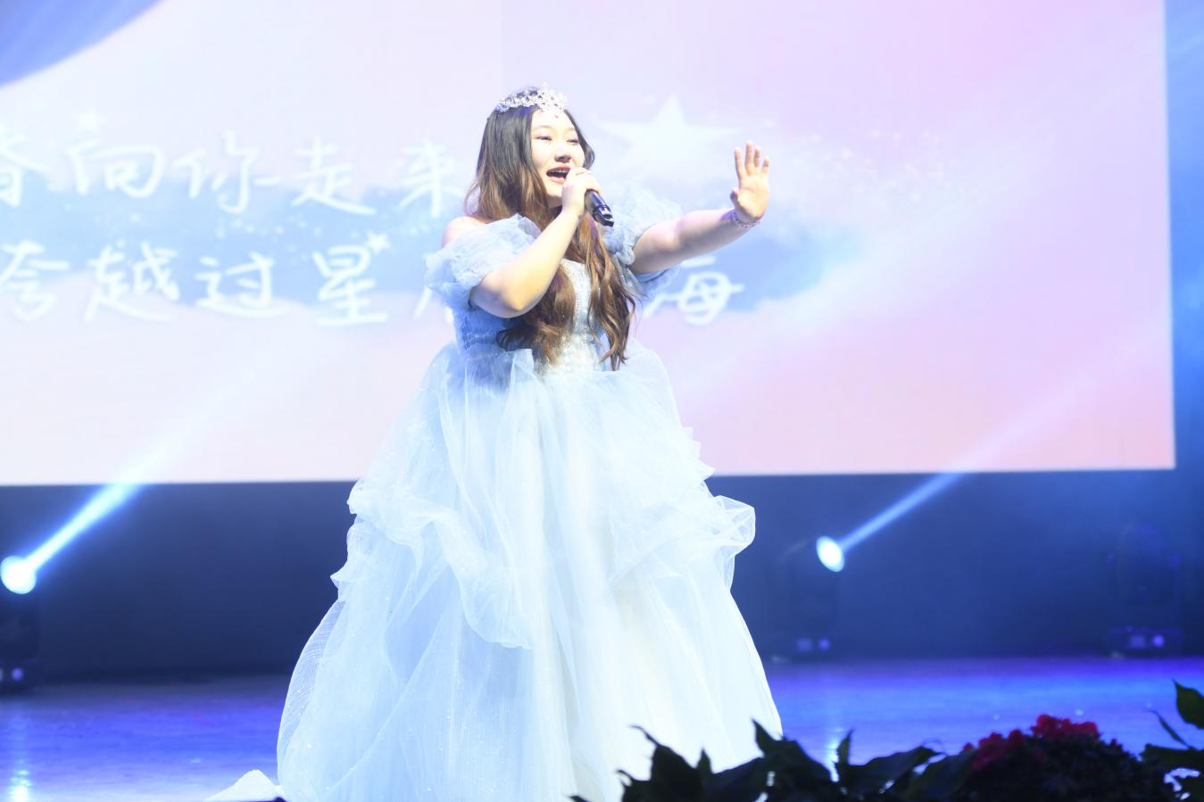 音乐与演艺学院青年教师陈娟登台献唱《绣红旗》,以过硬专业能力,饱含深情的演唱,唱出对祖国河山的热爱,将现场气氛烘托上了高潮,引起师生共鸣,赢得阵阵掌声。
