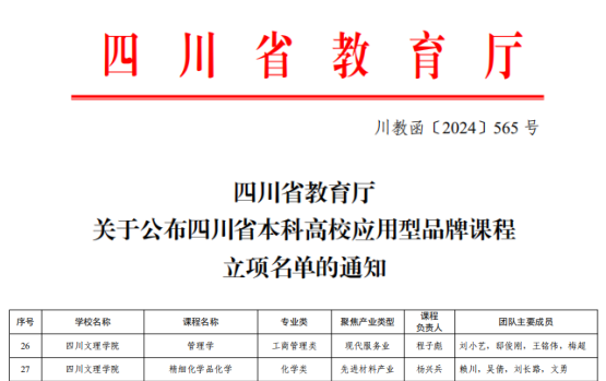 近日,四川省教育厅发布《四川省教育厅关于公布四川省本科高校应用型品牌课程立项名单的通知》(川教函〔2024〕565 号),开元官网《管理学》《精细化学品化学》成功获批立项省级应用型品牌课程。