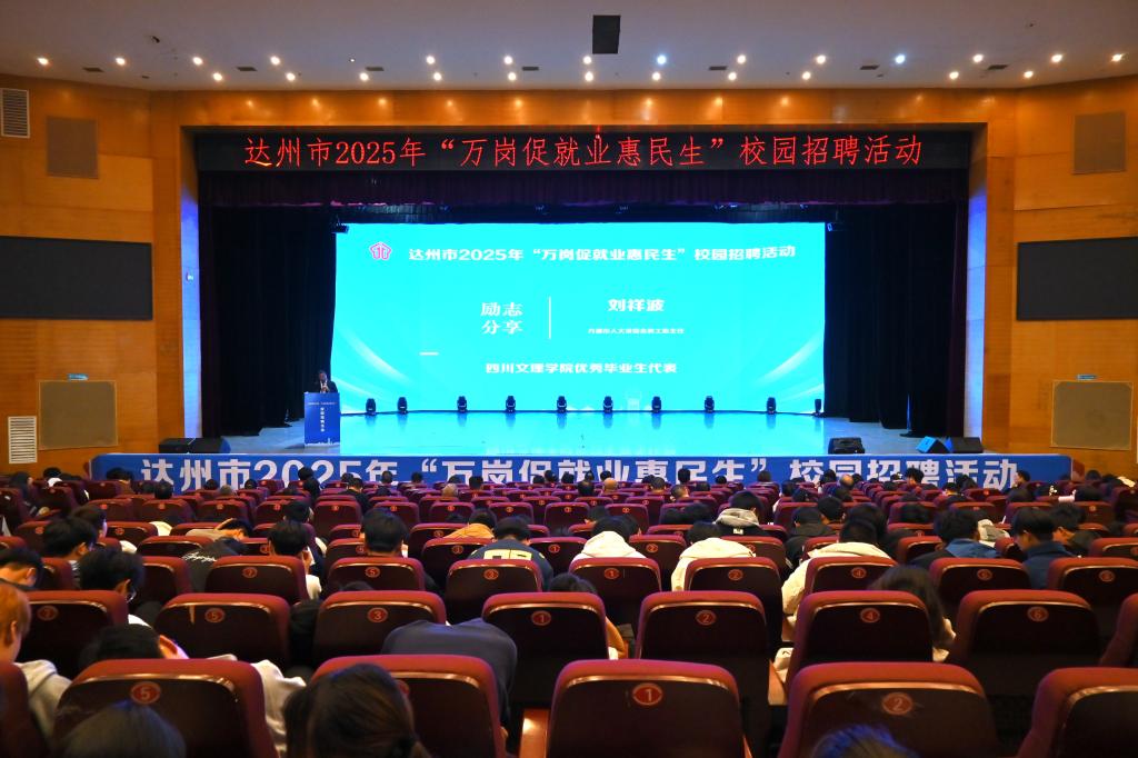 为加强校地校企资源对接,学校在音乐演播厅同步举办了就业供需对接会。达州市人社局、就业局及相关职能部门、四川正达凯新材料有限公司、中国移动达州分公司等30余家企业与校方围绕人才招聘、就业基地建设、产学研合作等展开深度洽谈。会上,学校招生就业处负责人陈峥峥做了2025届毕业生就业推介发言。达州市人力资源和社会保障局党组成员、副局长刘剑进行了企业岗位发布。学校优秀校友刘祥波以“追逐梦想,点亮未来”为题,与学弟学妹们分享了自己的就业成长历程,为毕业生点亮了求职就业之路。