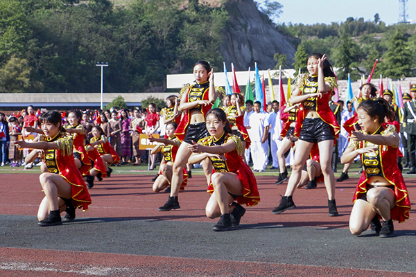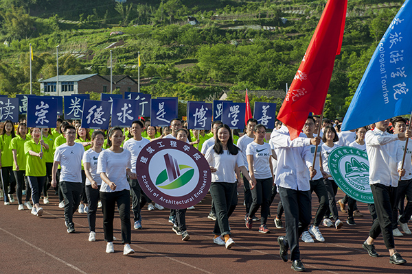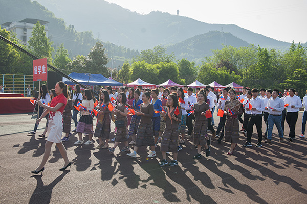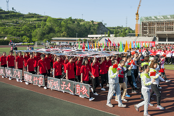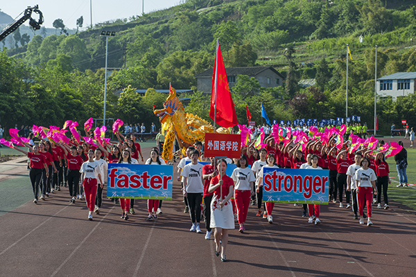 喊着嘹亮的口号,迈着铿锵的步伐,他们斗志昂扬地依次走过主席台。音乐与演艺学院方队跳动着轻逸的舞步经过主席台,绽放着他们的青春活力;外国语学院方队舞着“蛟龙”畅游赛道;身着民族盛装的留学生代表队,让人应接不暇;体育学院方队随着灵动俏皮的舞狮表演,吸引了全场目光,赢得了无数掌声与喝彩。