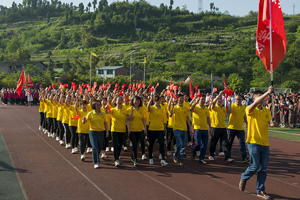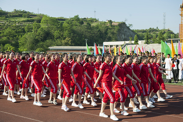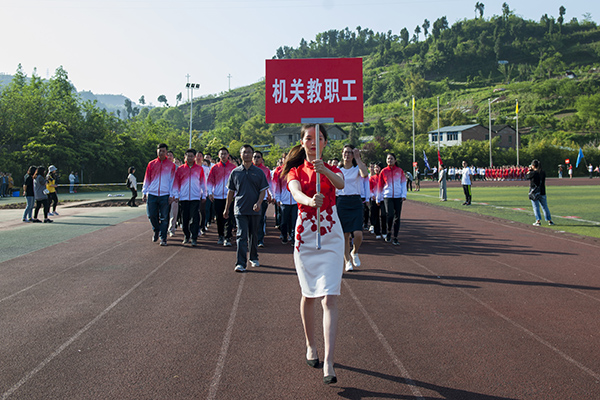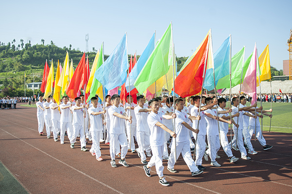伴随着《义勇军进行曲》,国旗仪仗队,气宇轩昂、英姿飒爽、步调整齐地走过主席台;紧接着是彩旗队、裁判员代表队以及各运动员代表队入场。