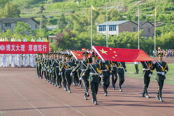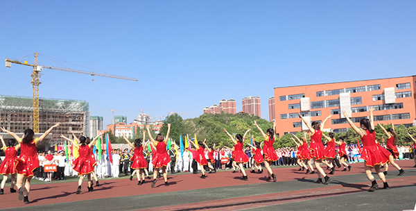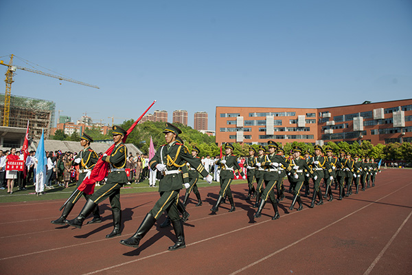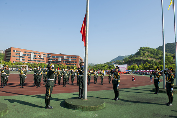 国旗仪仗队升国旗和校旗,全体师生齐唱国歌、校歌。