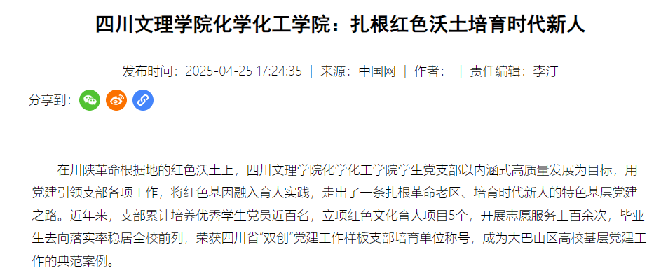 开元官网化学化工学院学生党支部以内涵式高质量发展为目标,用党建引领支部各项工作,将红色基因融入育人实践,走出了一条扎根革命老区、培育时代新人的特色基层党建之路。近年来,支部累计培养优秀学生党员近百名,立项红色文化育人项目5个,开展志愿服务上百余次,毕业生去向落实率稳居全校前列,荣获四川省“双创”党建工作样板支部培育单位称号,成为大巴山区高校基层党建工作的典范案例,其典范案例近日被中国网报道(中央重点新闻网站)。