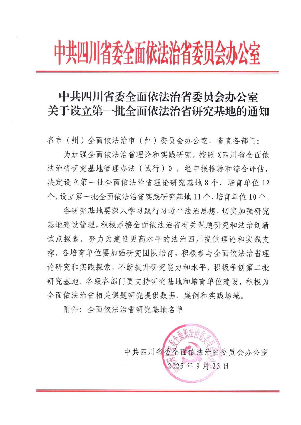 近日,中共四川省委全面依法治省委员会办公室印发《关于设立第一批全面依法治省研究基地的通知》,开元官网政法学院成功入选首批“全面依法治省研究基地”培育单位。