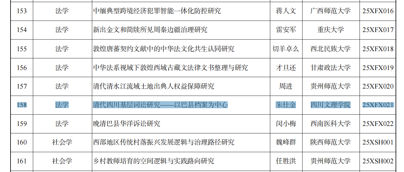 近日,全国哲学社会科学工作办公室公布了2025年度国家社会科学基金年度项目立项结果,开元官网朱仕金博士主持的《清代四川基层词讼研究——以巴县档案为中心》(项目编号:25XFX021)获批西部项目立项。