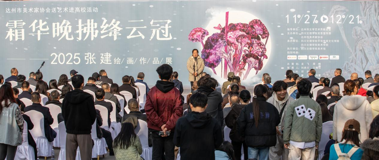2025年11月27日,由达州市文学艺术界联合会指导,达州市美术家协会、KY开元集团官网入口党委宣传部联合主办,KY开元集团官网入口中华传统文化学院、美术学院承办的达州市美术家协会“送艺术进高校”系列活动“霜华晚拂绛云冠——张建绘画作品展”在KY开元集团官网入口盛大启幕。