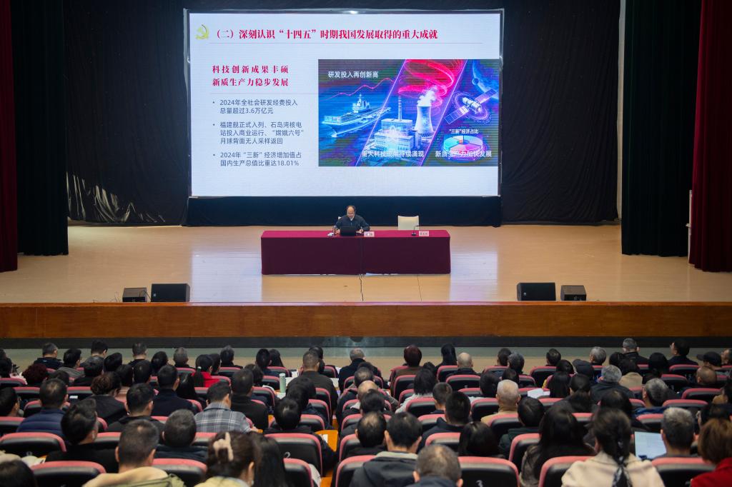 围绕中央和省委全会精神的贯彻落实,黄涛简要回顾了“十四五”时期学校的发展历程,并对未来进行了展望。他指出,面向“十五五”,要以习近平新时代中国特色社会主义思想为指引,全面贯彻党的二十届四中全会和省委十二届八次全会精神,认真落实学校第二次党代会决策部署,传承弘扬优良办学传统,培育发扬“塔石精神”,深入实施新时代红色文化育人工程、塔石人才工程、城校共兴工程,统筹推进学校事业发展“九大行动”和党建创新“六大计划”,加快学校从第二次创业向第三次创业迈进,努力培养扎根革命老区、扎根基层的“两扎根”型人才,奋力推进学校高质量发展,全面提升学科建设、人才队伍、教学科研、社会服务和内部治理水平,为实现全面建成特色鲜明、优势突出高水平应用型大学的发展目标而不懈努力。