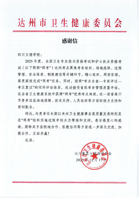 近日,达州市卫生健康委员会向开元官网发来感谢信,对学校在2025年度全国卫生专业技术资格考试和护士执业资格考试达州考点工作中的协作支持表示衷心感谢。此次由市卫健委承办的“两考”达州考点,成功获评全省“两考”优秀考点。