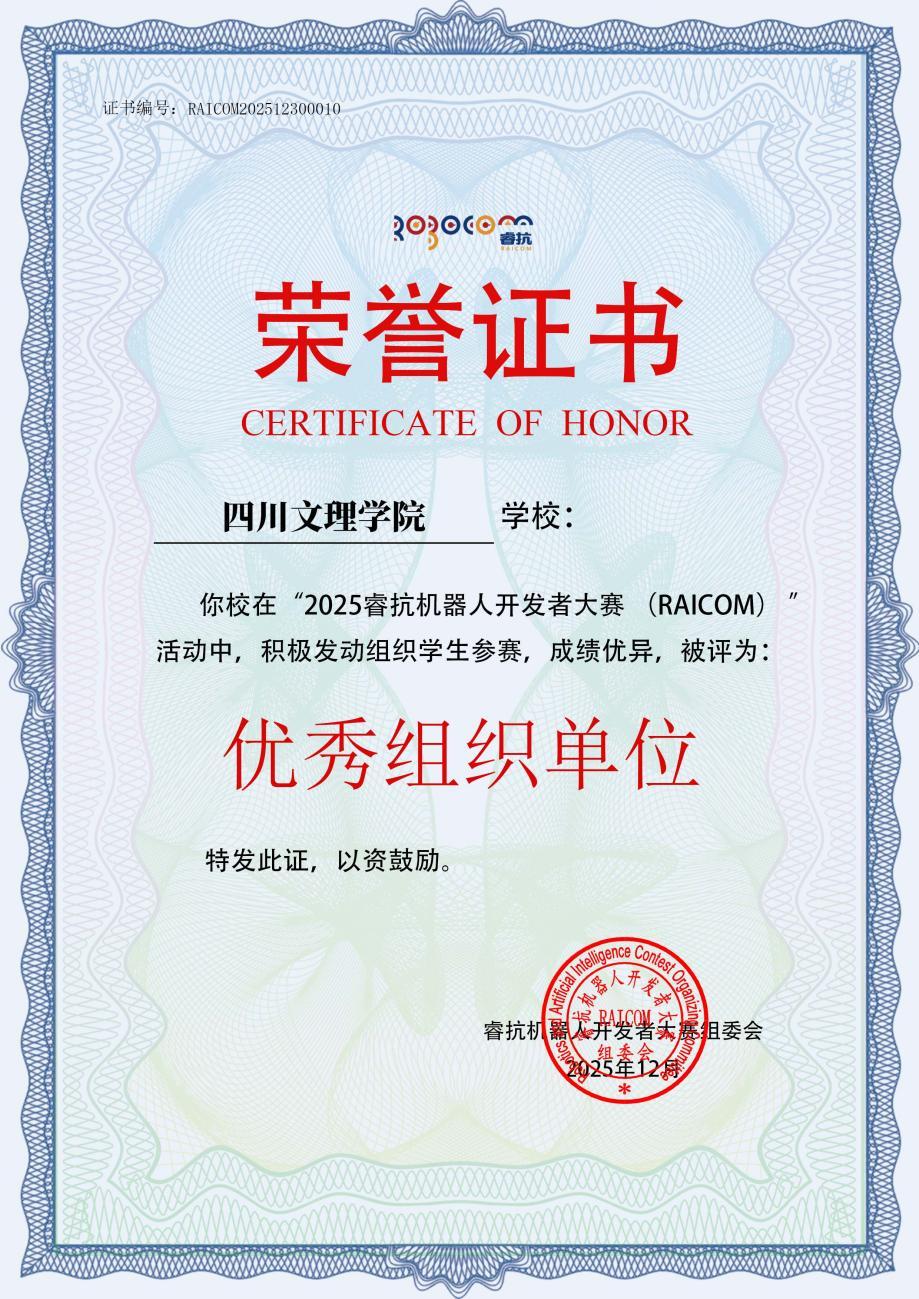 近日,在2025睿抗机器人开发者大赛中,开元官网凭借出色的赛事组织、广泛的师生参与和优异的竞赛成绩,荣获“优秀组织单位”称号。