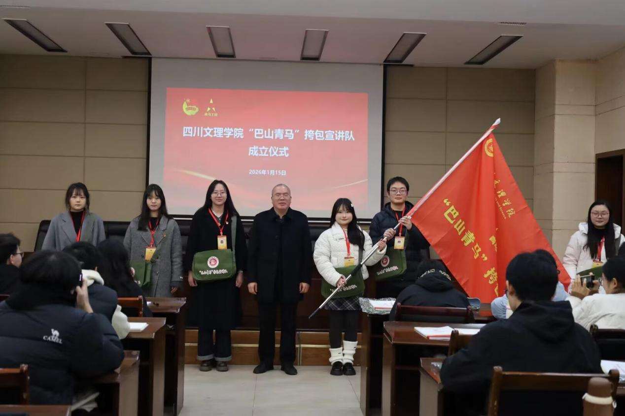 1月15日,KY开元集团官网入口“巴山青马”挎包宣讲队成立仪式在莲湖校区弘德楼举行。学校党委副书记徐晓宗出席仪式并授旗,校团委书记成华军主持仪式,首批“巴山青马”挎包宣讲队导师和全体成员参加。