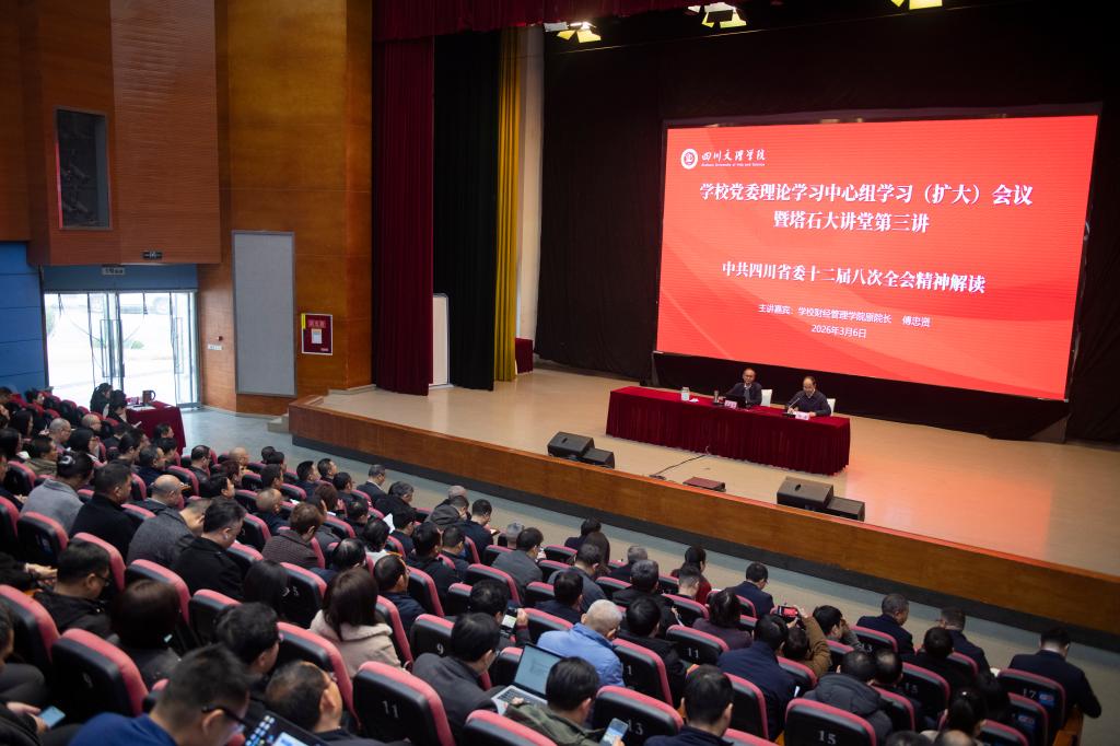 3月4日至7日,学校在莲湖校区举办学习贯彻党的二十届四中全会精神处级干部读书班暨科级干部、党员扩大学习会。党委书记黄涛和校长侯忠明分阶段主持会议并讲话。西南科技大学环境与资源学院党委书记代群威教授、西华师范大学机关三党总支书记兼学科建设处副处长高思超教授、学校财经管理学院原院长傅忠贤教授应邀做客塔石大讲堂作专题辅导。