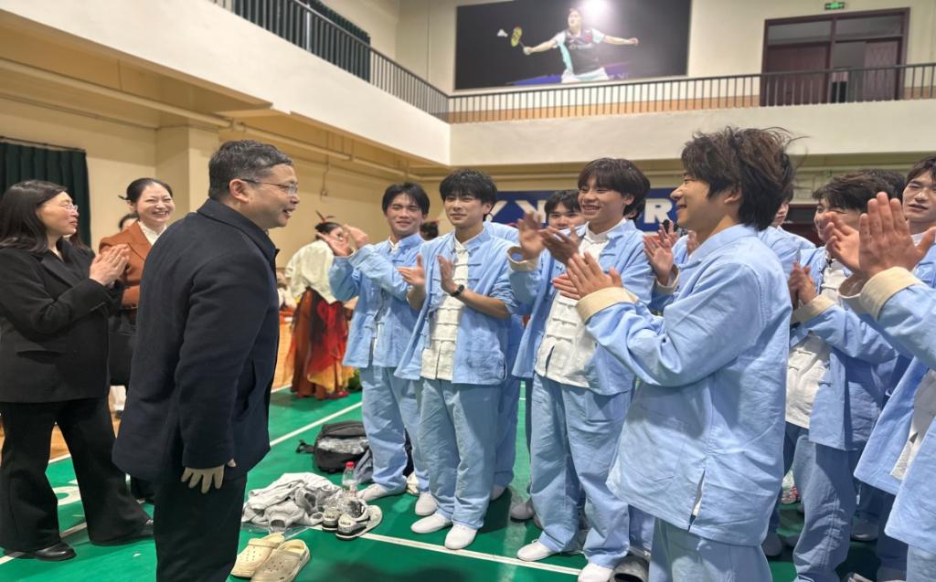 三月巴渠大地,热浪滚滚,达州市体育中心,激情飞扬。3月13日晚,2025/2026赛季四川省城市足球联赛决赛阶段开幕式在这里盛大举行。演出前夕,带着对美育实践的关切和对400名演出学生的牵挂,侯忠明校长、邓杰副校长专程来到达州市体育中心的羽毛球馆,看望慰问这群即将走向足球场表演舞台的学子们。
