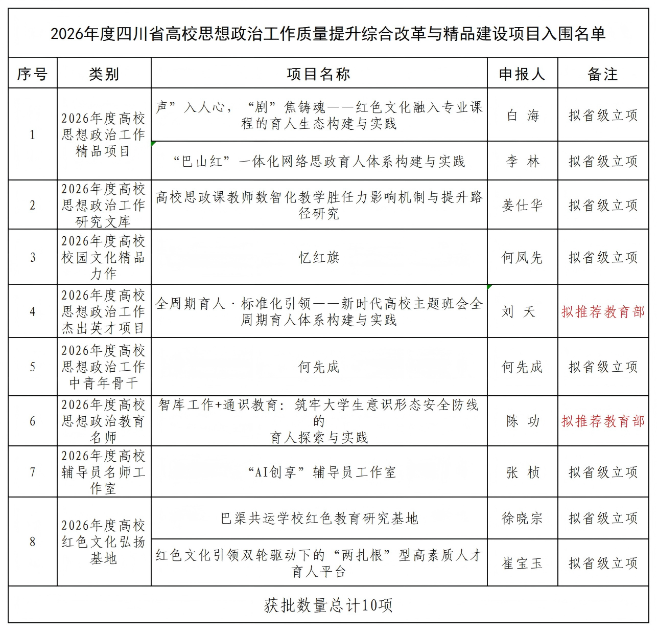 近日,四川省教育厅公布2026年度四川省高校思想政治工作质量提升综合改革与精品建设项目入围名单,开元官网成功获批10项(其中2项拟推荐教育部)。项目涵盖思政工作精品项目、思政工作研究文库、校园文化精品力作、杰出英才、思政工作中青年骨干、思政教育名师、辅导员名师工作室、红色文化弘扬基地等8个大类。立项数量与覆盖领域均创历年最好成绩,标志着学校思想政治工作精品化、体系化、品牌化建设迈上新台阶。