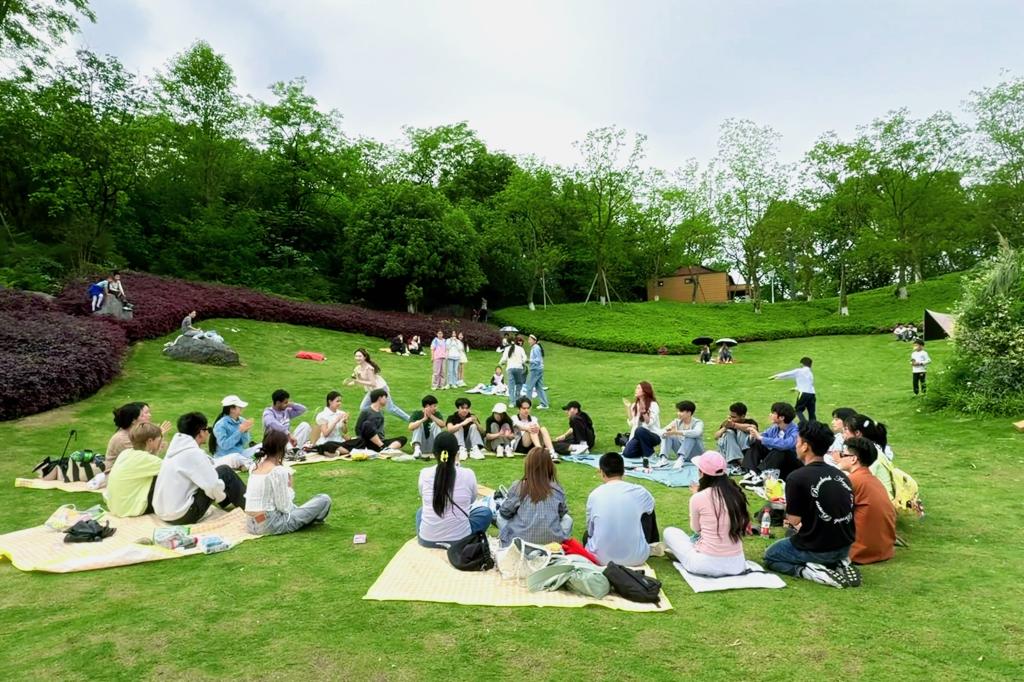 活动伊始,大家围坐草坪,在充满童趣的“丢手绢”游戏中,追逐奔跑,笑声与欢呼声此起彼伏,轻松的氛围打破了语言与国籍的边界,让大家卸下拘束、快速拉近距离。一旁的游客纷纷驻足,用手机记录下这欢乐瞬间,小朋友们也主动上前,热情地与留学生互动。